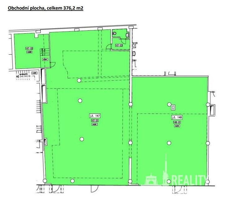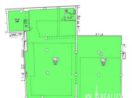 Prostor lze pronajmout jako celek, nebo lze rozdělit na dvě samostatné jednotky (o výměře: j.č. 147 – 242,9 m2 a j.č. 148 – 133,3 m2).