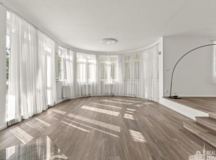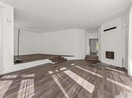 Dominantou přízemí je velkorysý obývací pokoj s krbem o rozloze 51,3 m², který nabízí prostor pro kulečník, domácí kino nebo relaxační zónu. V případě potřeby lze pokoj rozdělit příčkou a vytvořit další samostatnou místnost.