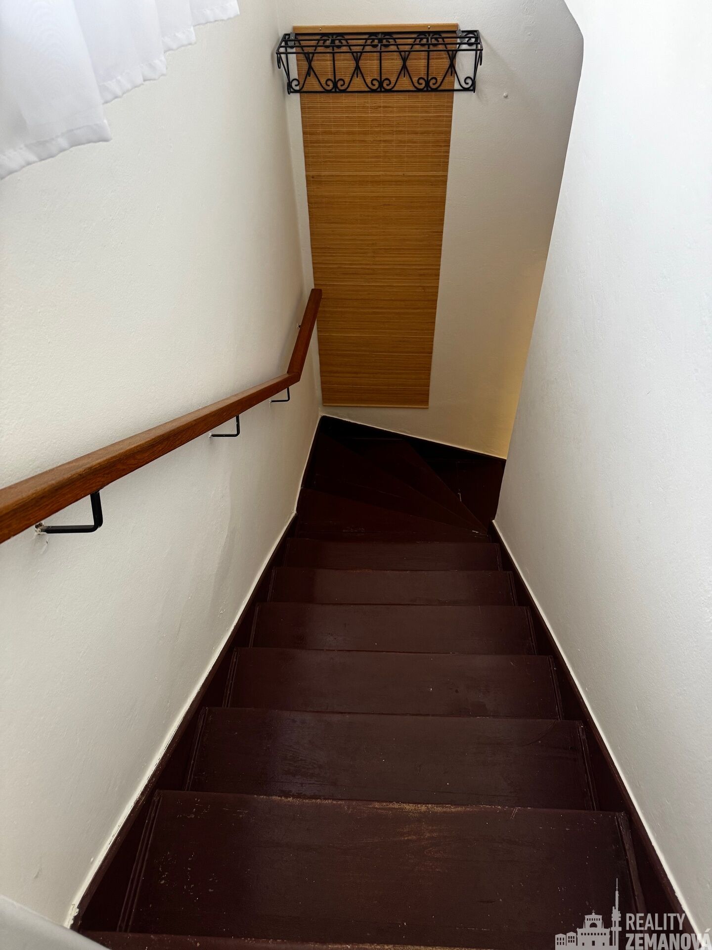 1. patro: WC, dva světlé průchozí pokoje, balkon do ulice a místnost/šatna s příkrými mlynářskými schody do 2. patra/podkroví, kde jsou dva průchozí podkrovní pokoje.