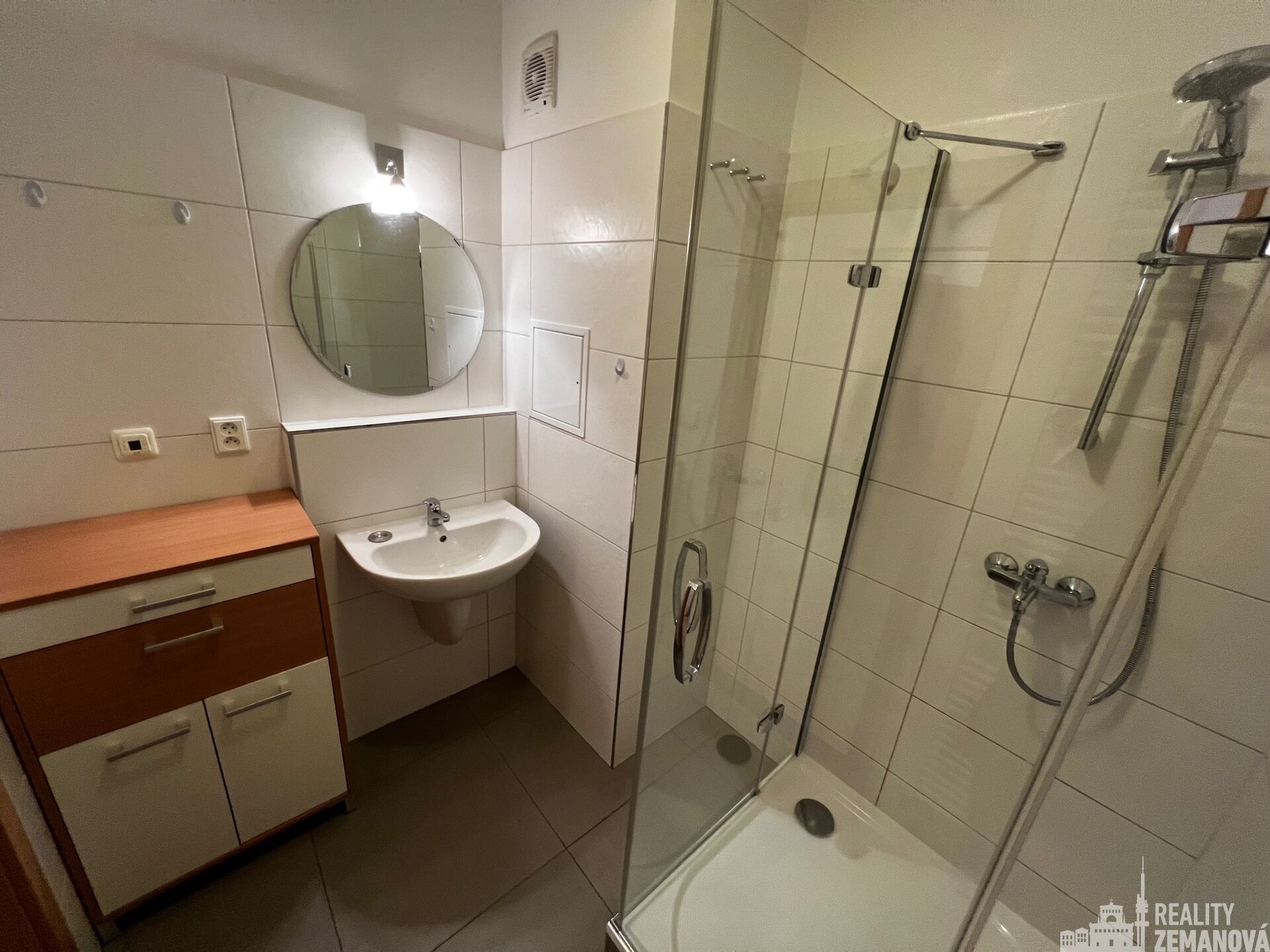 Nabízíme k dlouhodobému pronájmu zařízený a útulný byt. Dispozičně se jedná o 2+kk s prostorným čtvercovým balkonem cca 4,7 m2, koupelnou se sprchovým koutem, samostatným WC s umyvadlem, komorou (s automatickou pračkou) a prostornou halou s vestavěnými skříněmi. Byt je o velikosti celkem 69,4 m2 a nachází se ve 4. NP/3.patře domu s výtahem. Kuchyňská linka je vybavena všemi potřebnými elektrospotřebiči (sklokeramická deska, el. trouba, digestoř, myčka, nová volně stojící lednice s mrazákem). V ložnici je postel, komoda. V obývacím pokoji sedačka, kulatý stůl se židlemi, policové skříňky.
