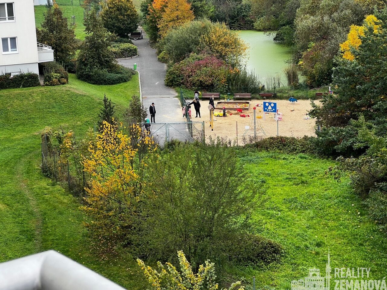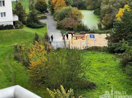 Výhled z obývacího pokoje a balkónu do zeleně a k dětskému hřišti. Naprostý klid.