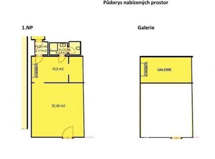 Vestavěnou galerii 19,8 m² v zadní části – ideální jako kancelář či sklad, bez účtování nájemného