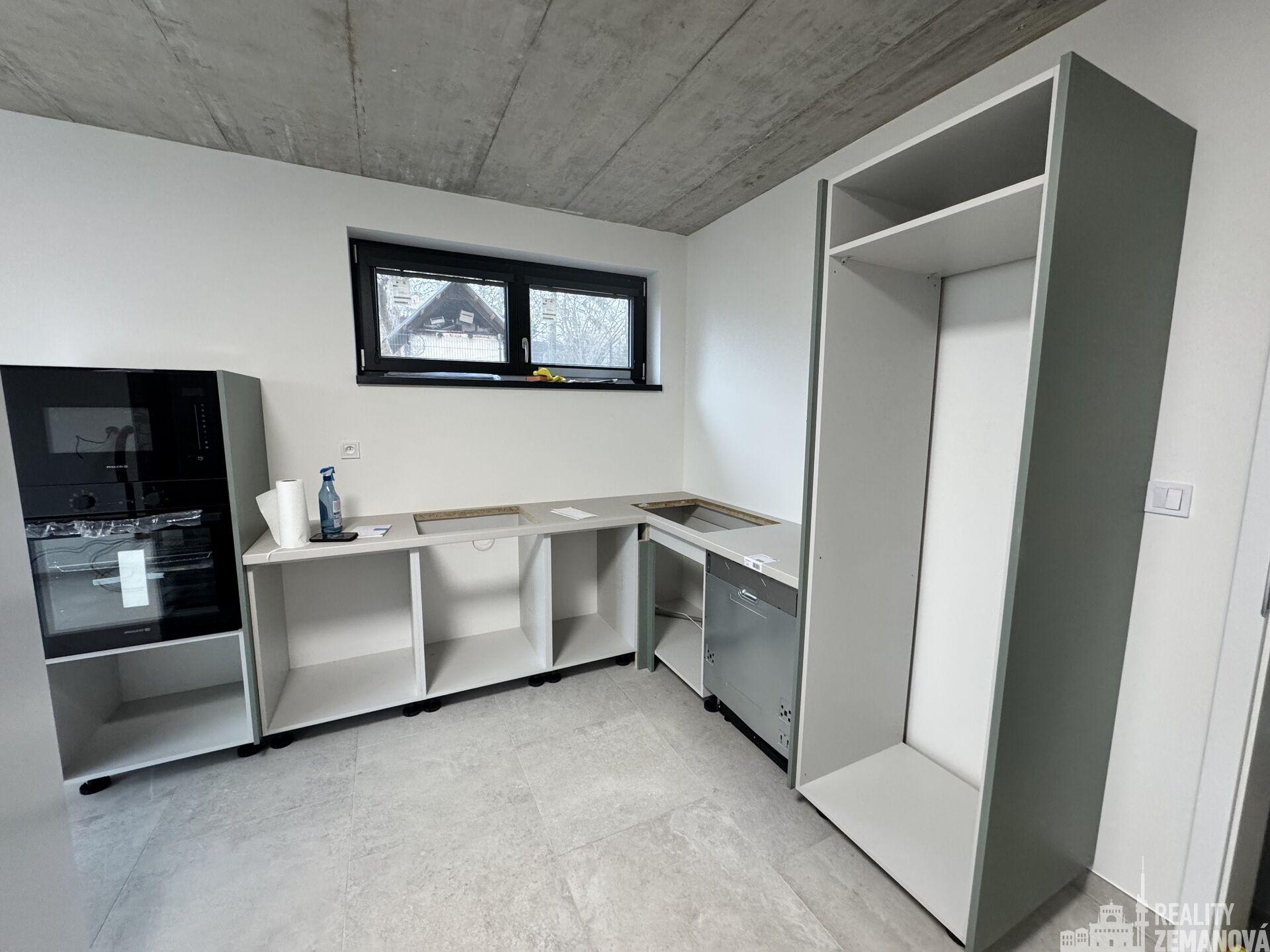 obývací pokoj s kuchyňským koutem 19,3 m2 (bude dodána zelená linka, černé spotřebiče: myčka, lednice s mrazákem, trouba, mikrovlnka, digestoř)