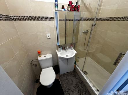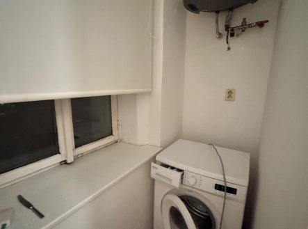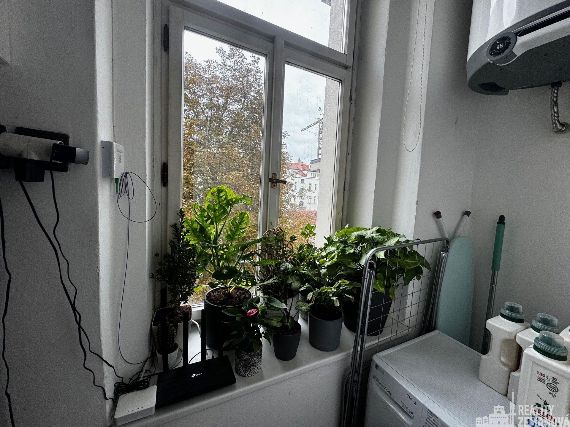 Dispozice bytu: předsíň s oknem orientovaným do klidného vnitrobloku, vybavená automatickou pračkou a bojlerem pro ohřev teplé vody, plynule navazující na kuchyňský kout s pěknou kuchyňskou linkou, elektrickým sporákem, lednicí a bílým jídelním stolem se čtyřmi židlemi. Z kuchyně je vstup do koupelny se sprchovým koutem, umyvadlem a WC a dále do prostorného pokoje orientovaného do Řipské ulice na západ. Pokoj je vybaven bílou skříní (viz foto) a velkou postelí. Vše ve velmi dobrém stavu. Vytápění je zajištěno topidlem WAW.